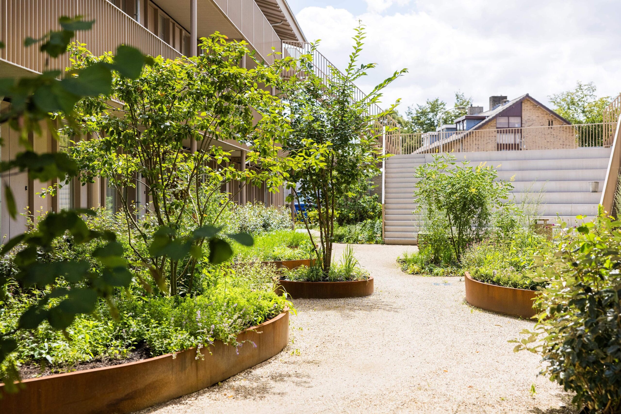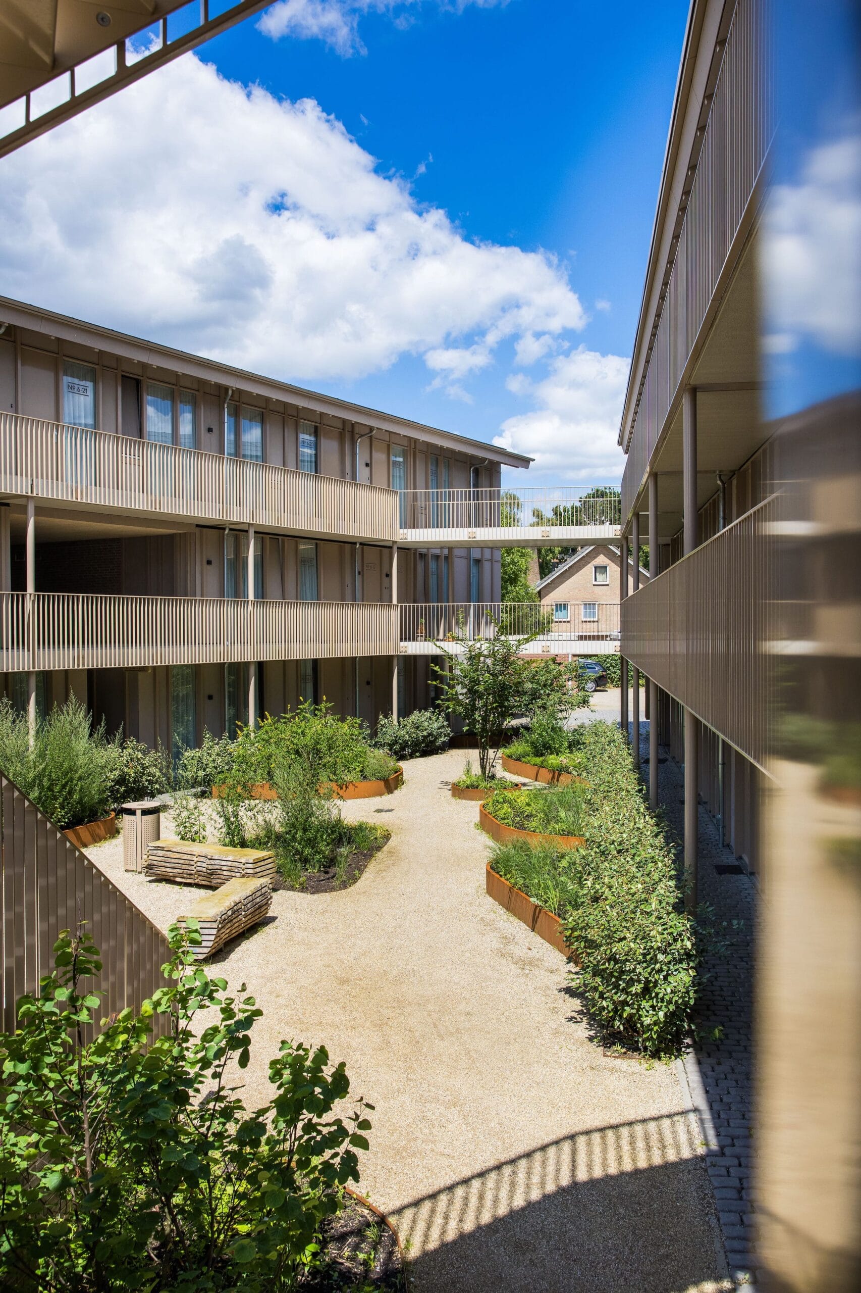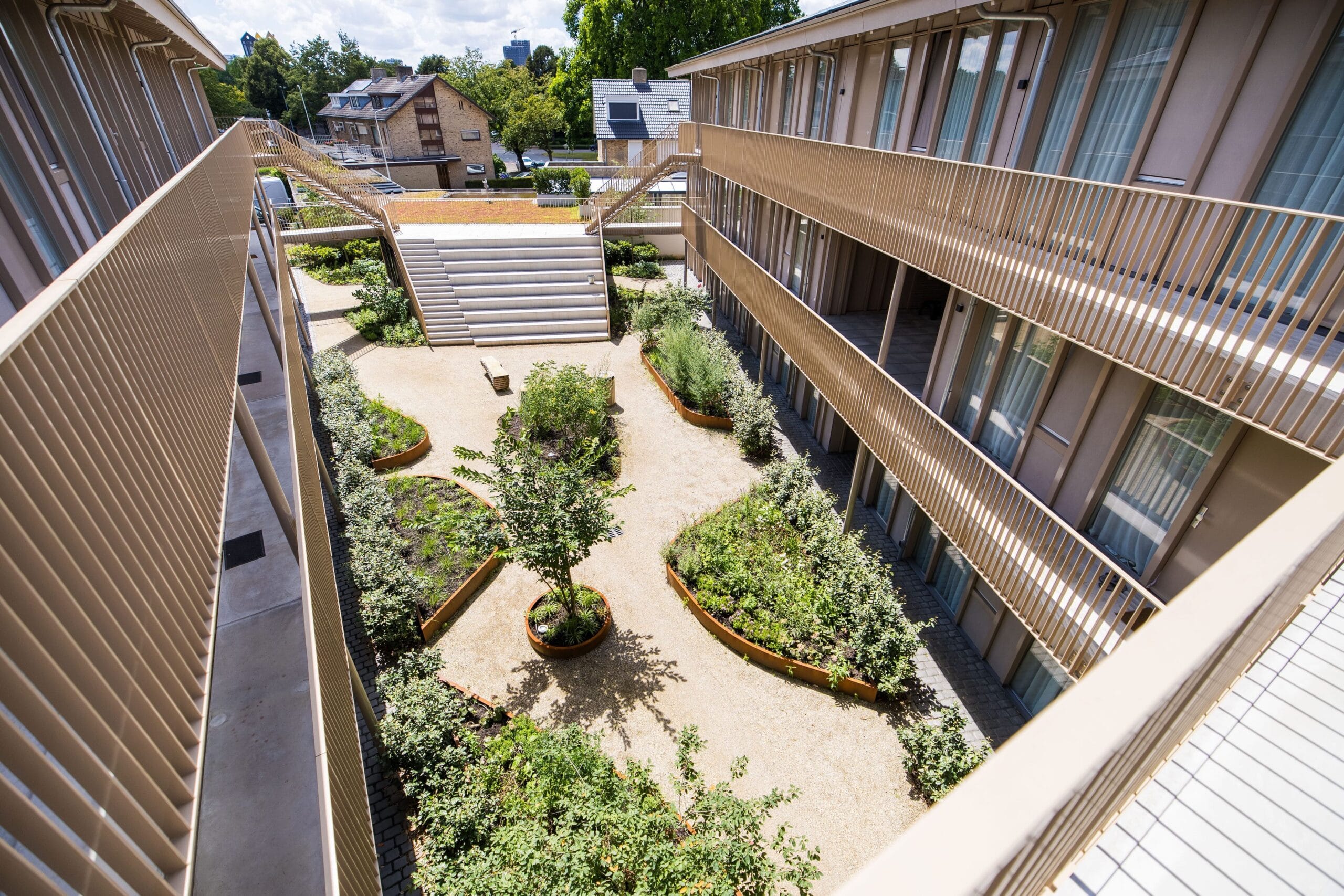 De opdrachtgever van dit appartementencomplex in Eindhoven wilde een natuurlijke, uitnodigende buitenruimte voor de bewoners. In deze patiotuin is dat volledig tot leven gekomen door uitsluitend met natuurlijke materialen te werken. Het resultaat is een stijlvolle, harmonieuze buitenruimte waar bewoners graag verblijven.