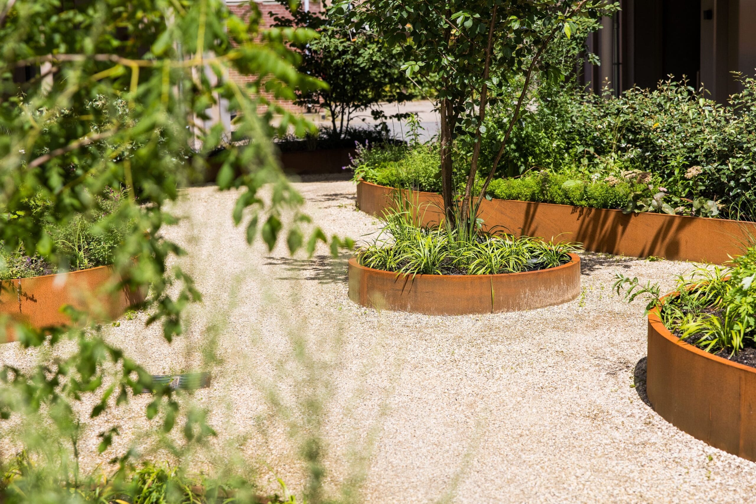 Omdat de tuin midden in het centrum ligt, is gekozen voor waterdoorlatende ondergronden. Hierdoor kan regenwater eenvoudig in de bodem wegzakken, worden plassen en wateroverlast voorkomen én ontstaat een gezonde basis voor sterke plantgroei.
